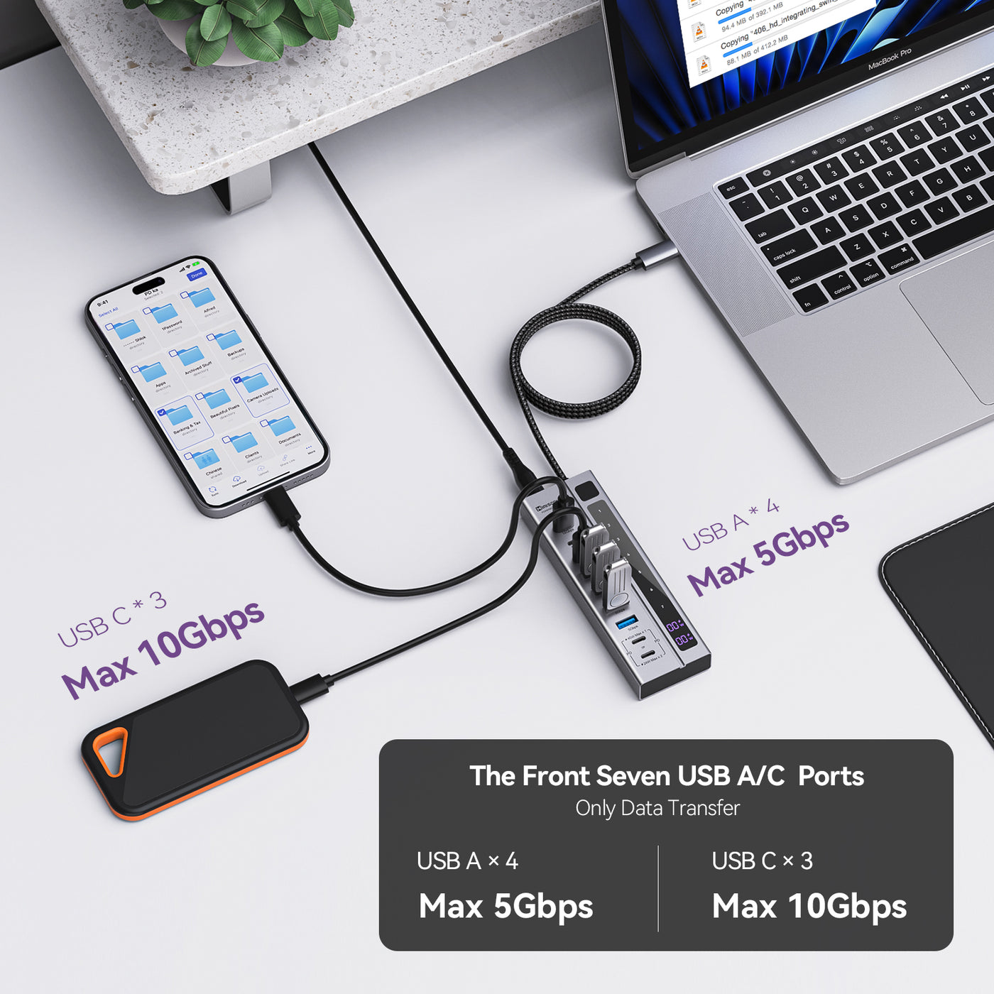 The usb-c to usb-c hub supports data transfer up to 10Gbps, which is 20 times faster than a USB 2.0 port, it can transfer files, audio, and video efficiently in seconds to external devices. ★Note: The three USBC 3.2 at the top of the USB c ports hub and the four USBA 3.0 at the middle fo the hub ONLY support data transfer.