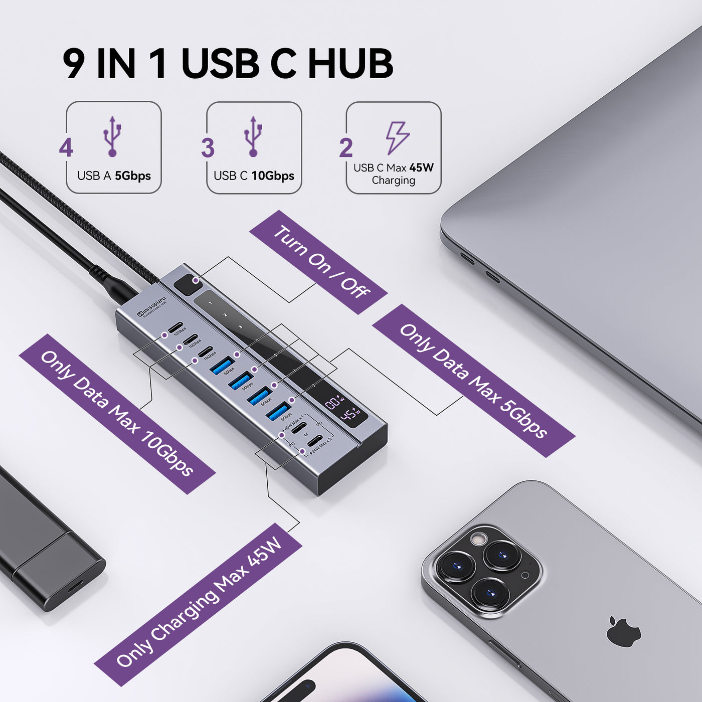 • ⚡【Minisopuru 9-IN-1 USB C Hub】: The Powered USB Hub is equipped with 2* USBC (Max 45W) charging ports, 1* USBA 3.0 data and charging ports (Max 7.5W), 3*USBA 3.0 data ports and 3*10Gbps USBC 3.2 data ports. ★Note: All ports of the Powered USB C Hub do not support video output, make sure the power adapter is connected to the USB hub, otherwise it will not work.