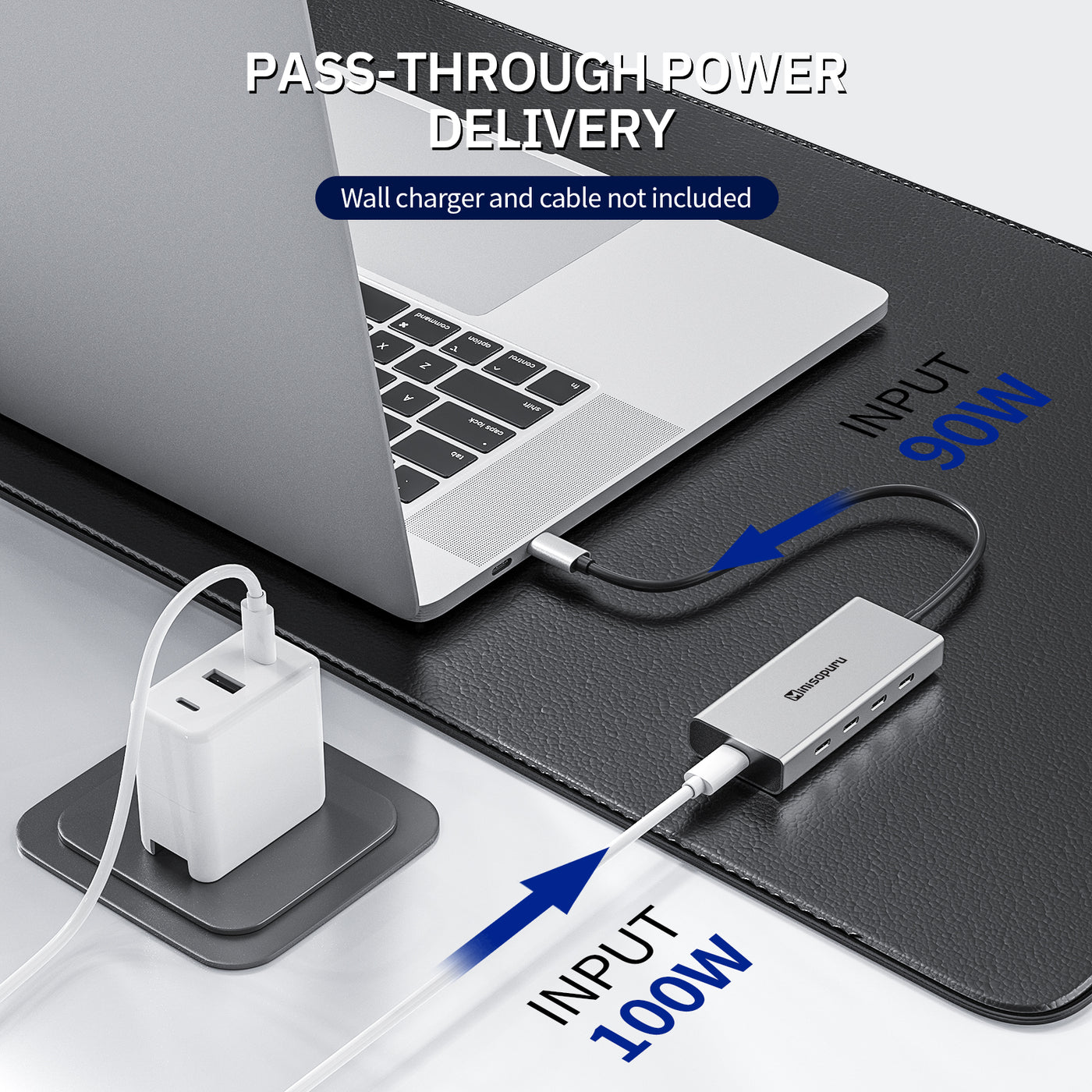 The Minisopuru USB-C splitter supports power charging and the PD port supports up to 100W input and up to 90W (safe) continuous power to charge your laptop. Please note that the Power Adapter is not included and ensure that your laptop's USB-C port supports charging.