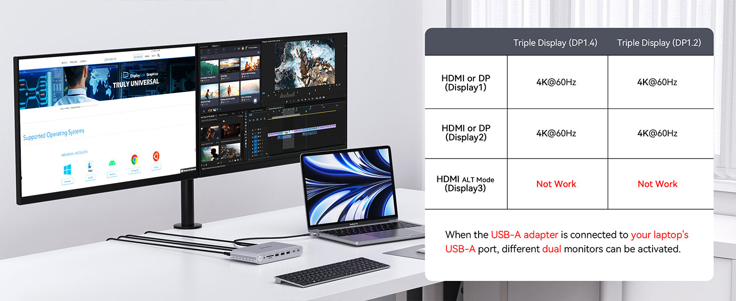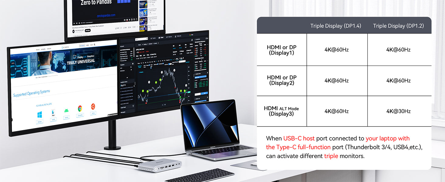 The Display Link docking stations with 3x HDMI and 2x DisplayPort By installing the DisplayLink driver: 2x 4K DisplayPort(DisplayLink Driver), 2x 4K HDMI (DisplayLink Driver), 1x HDMI Alt Mode(Display3).