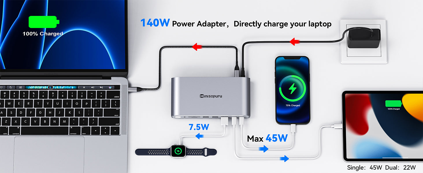 This triple display docking station comes with a 140W power adapter without an additional power adapter, directly provides up to 85W fast charging for your laptop, and simultaneously can use the USB-C port on the front of the docking station to provide up to 45W charging for your phone and iPad.