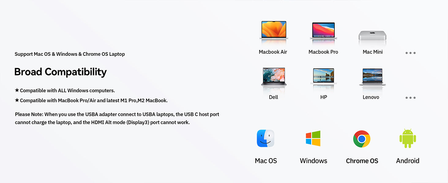 The USB C docking station is compatible with Thunderbolt 4/3, MacBook M1 M2, Windows, Chrome OS, Ubuntu, etc full-featured USB-C laptops and Android.