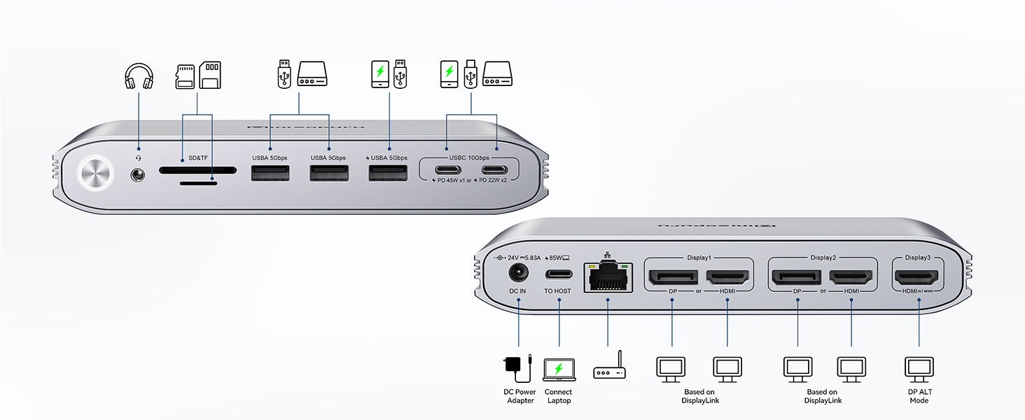 The docking station 3 monitors feature 3x USB A 3.2Gen1 and 2x Type-C ports, also charge your external devices at the same time. The 3-monitor docking station is also equipped with a TF/SD card slot.
