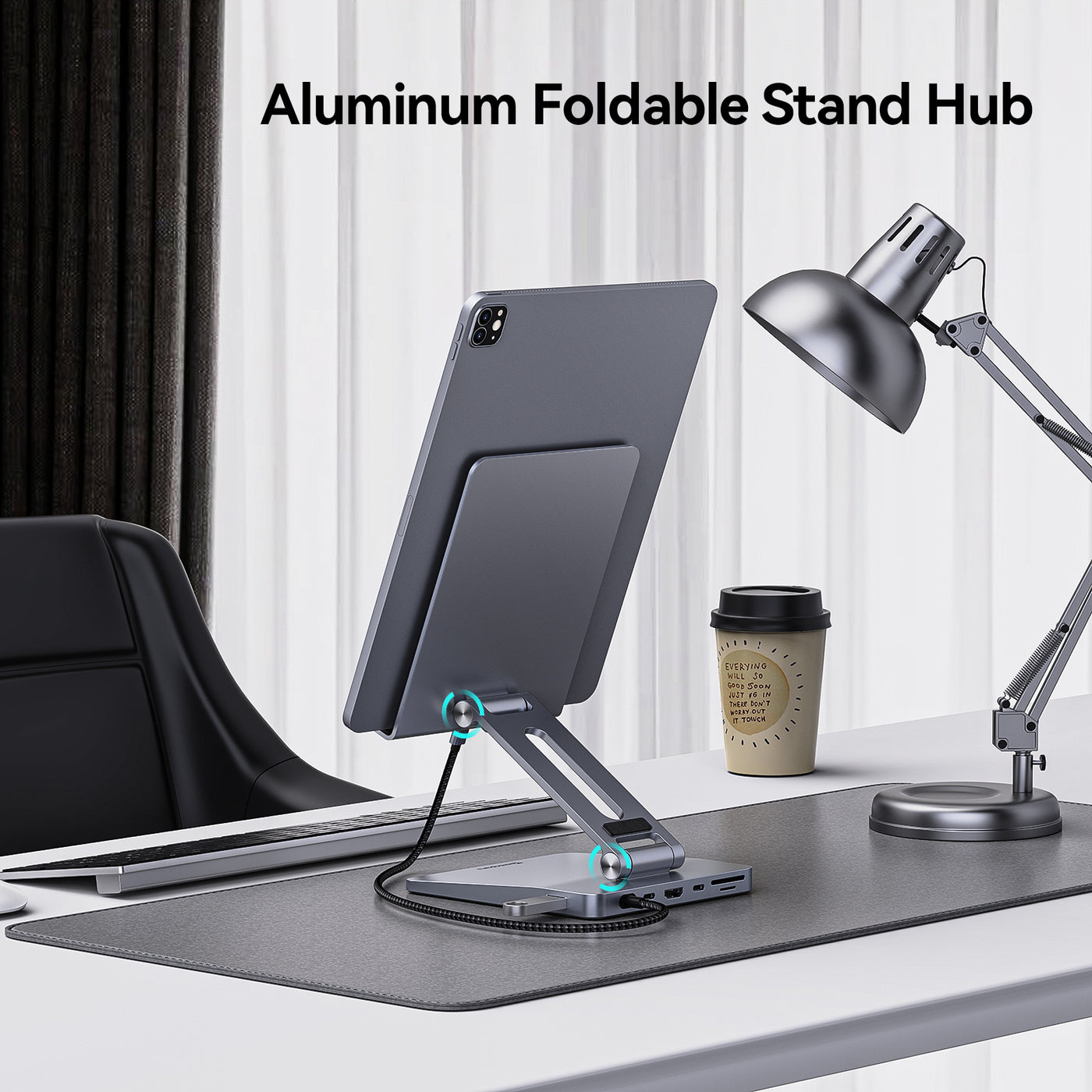 - 【Aluminum Foldable Design】: The iPad Pro hub is the perfect combination of a foldable stand and hub, adjusting your iPad Pro to the ideal angle, height, and orientation. The iPad Pro dock's sleek design provides an efficient workspace, allowing the iPad or USB-C tablet to be more creative. The iPad stand is suitable for any venue, like travel, office, home, etc.