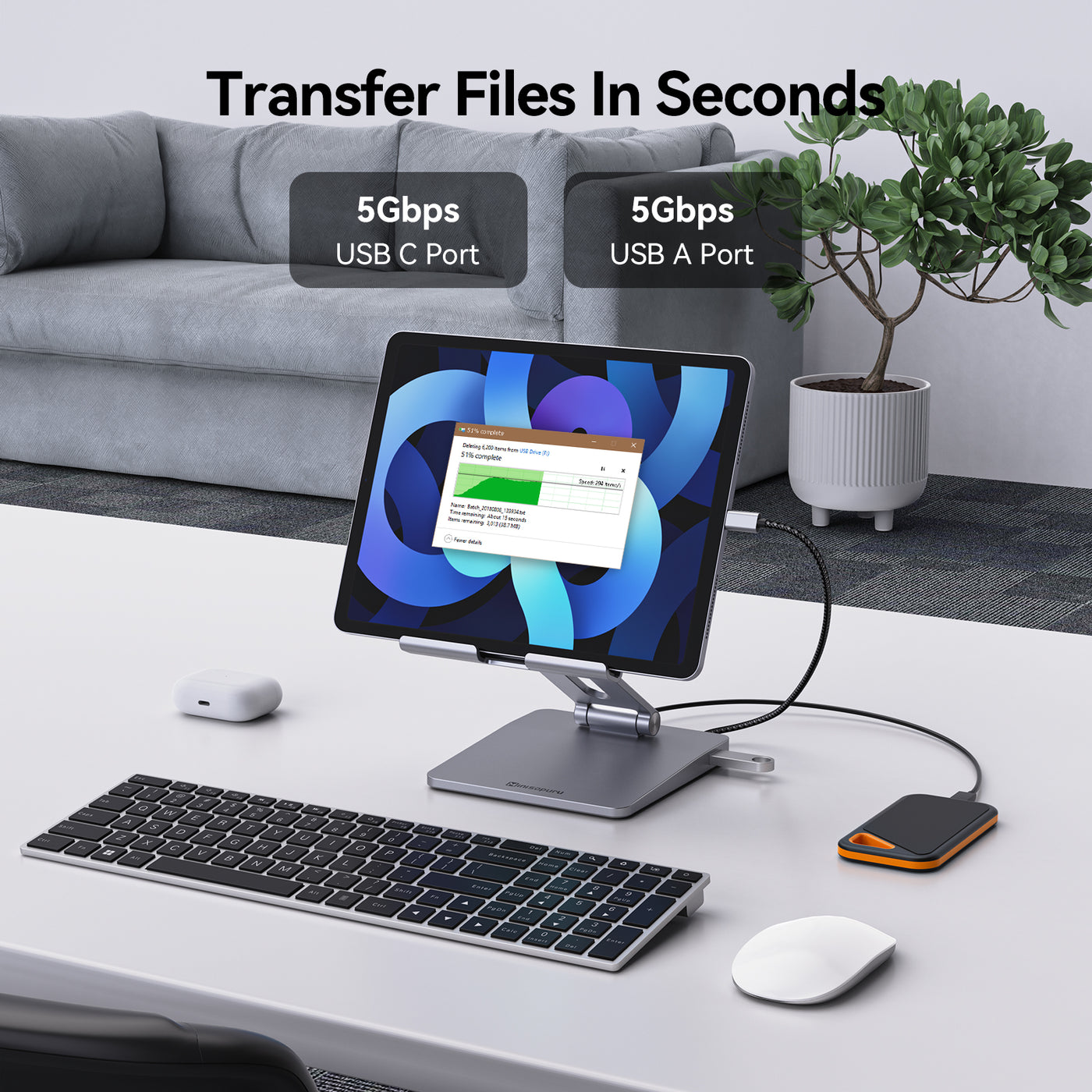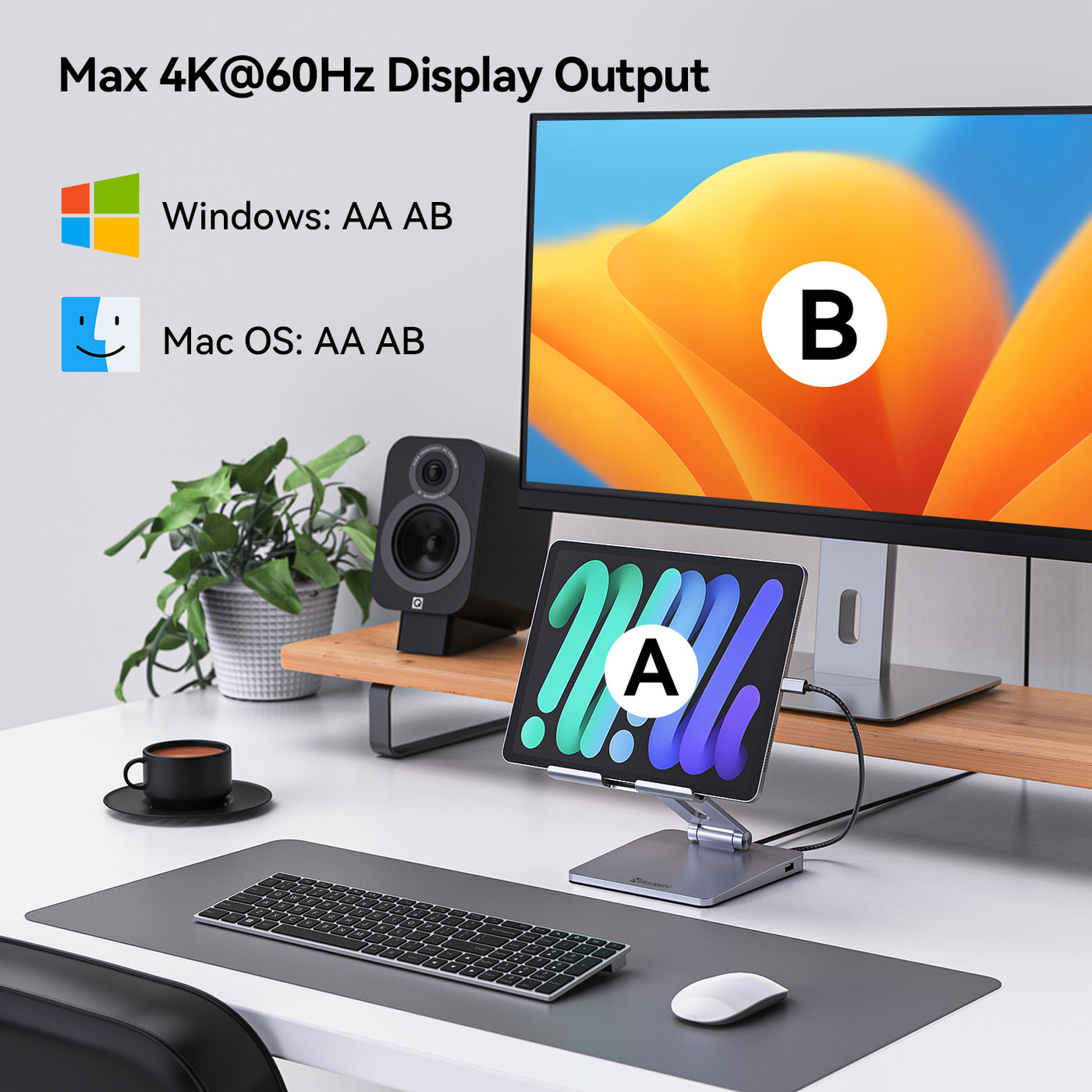 This iPad docking station supports up to 4K@60Hz and can connect an external display to provide you with a high-quality viewing experience. This iPad Pro USB Hub supports Mirroring and MST modes under the Mac OS system and Windows systems. This iPad air dock connects external devices via 5Gbps, allowing efficient file transfer.