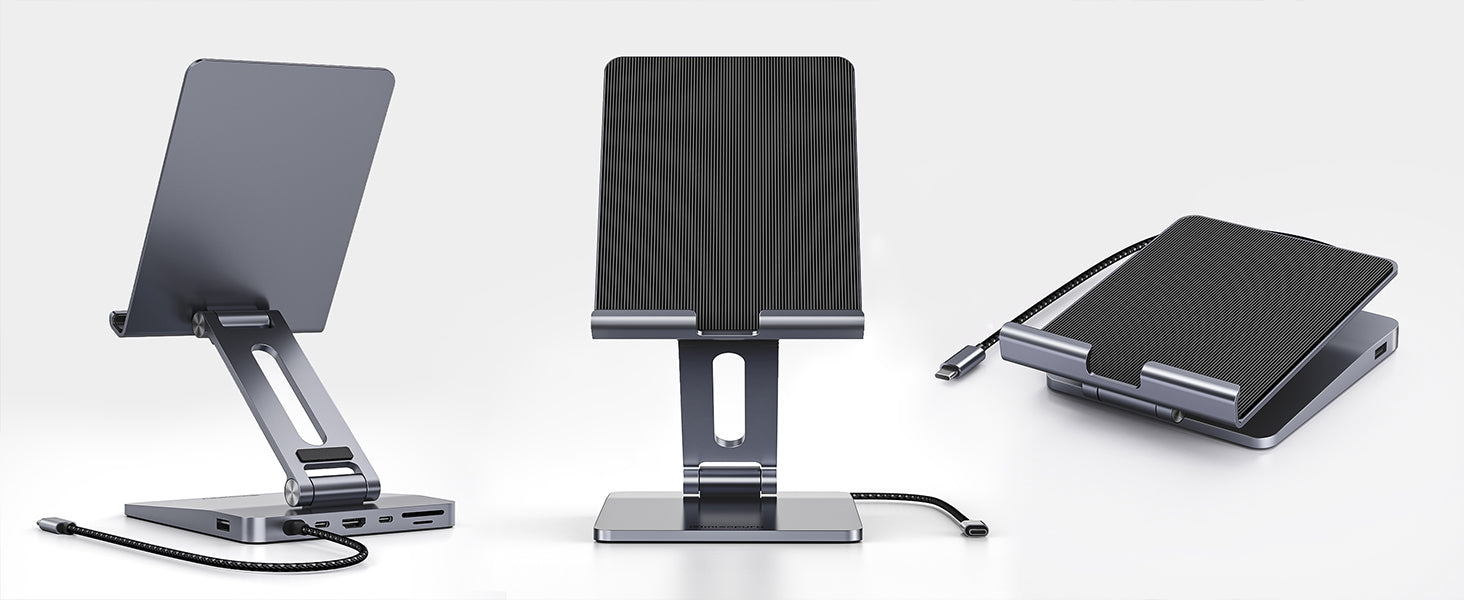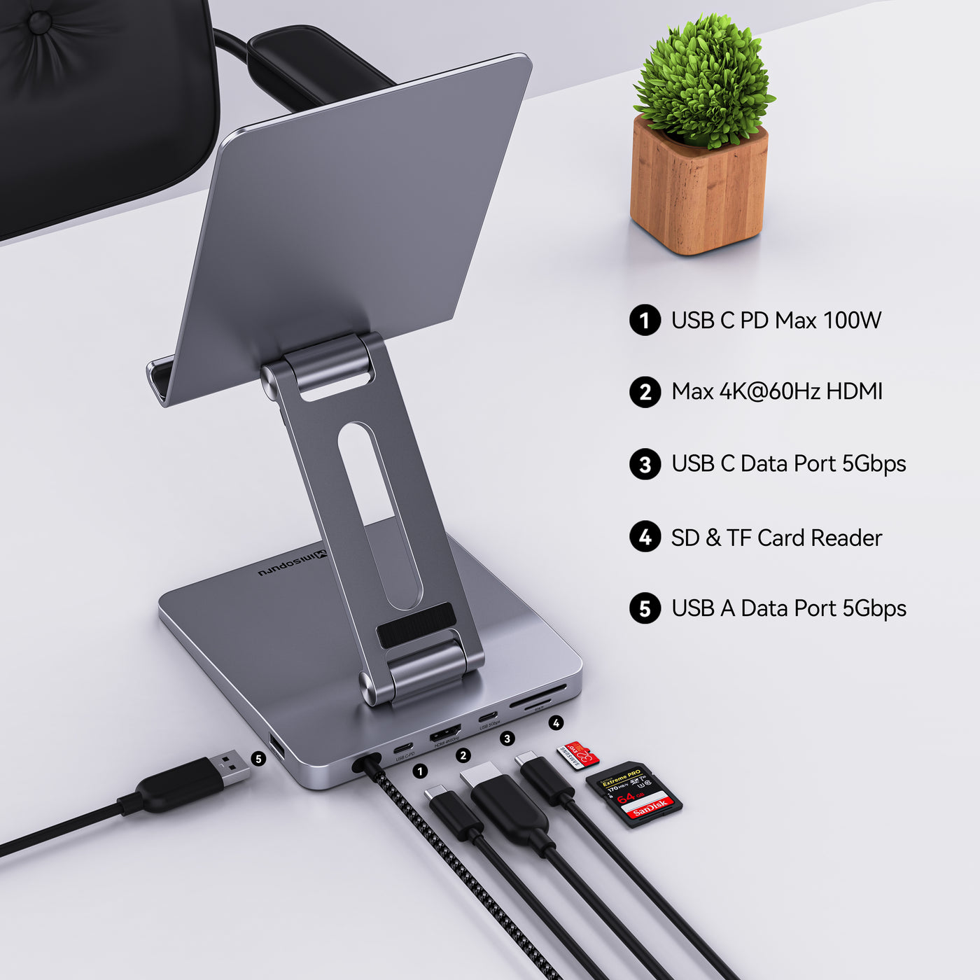 The iPad Pro hub is the perfect combination of a foldable stand and hub, adjusting your iPad Pro to the ideal angle, height, and orientation. The iPad Pro dock's sleek design provides an efficient workspace, allowing the iPad or USB-C tablet to be more creative. The iPad stand is suitable for any venue, like travel, office, home, etc.